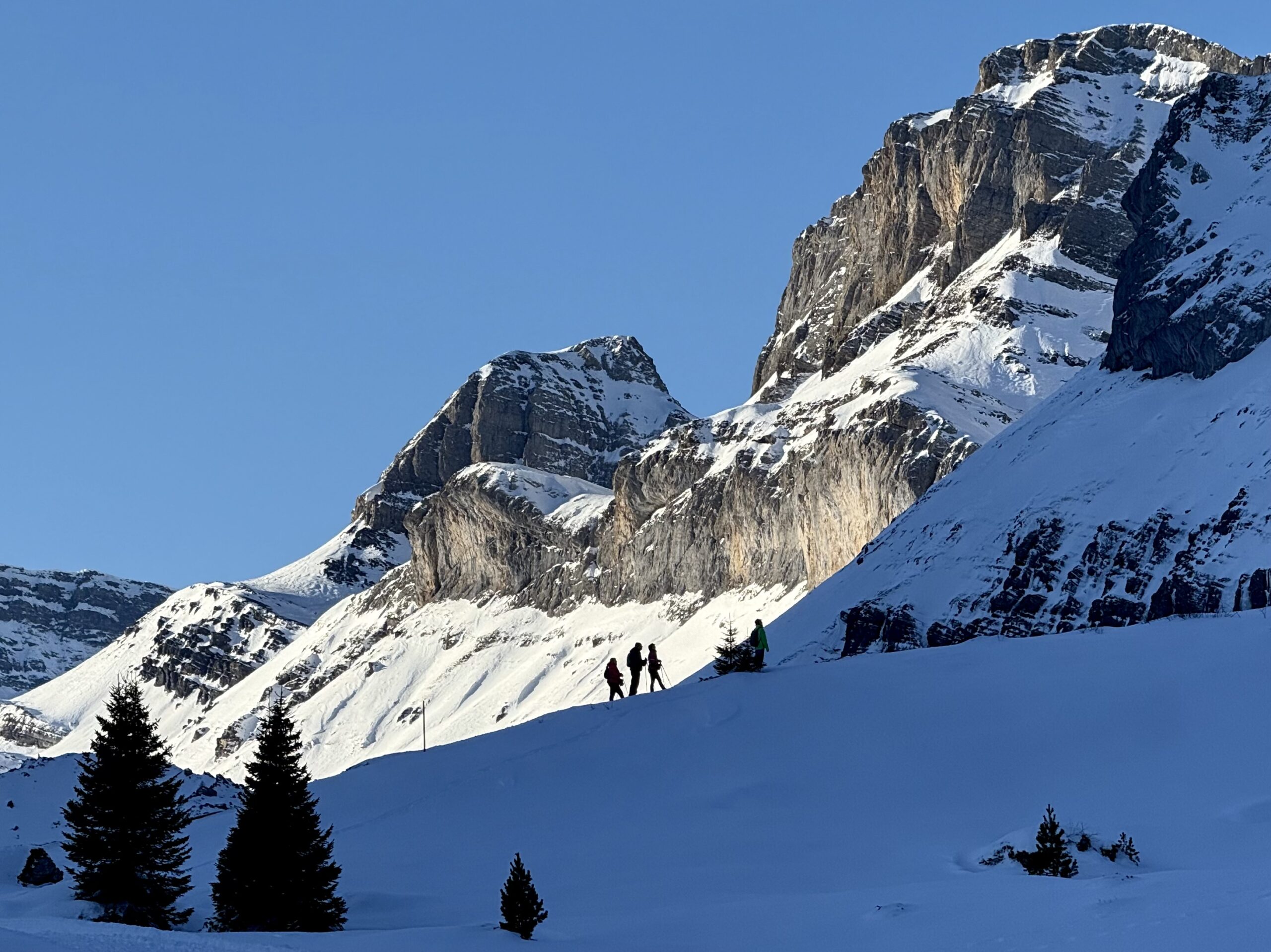 Auf gut markierten Routen durch unberührte Winterlandschaften: Während der eine Trail in die Stille der Spitelmatte führt, lockt der andere mit Fernsicht bis ins Gasterntal. Schneeschuhe gibt es dabei in der Bergstation auch zum Mieten.